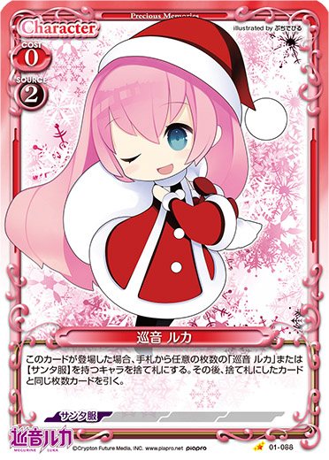 | このカードが登場した場合、手札から任意の枚数の「巡音 ルカ」または【サンタ服】を持つキャラを捨て札にする。その後、捨て札にしたカードと同じ枚数カードを引く。 | ||