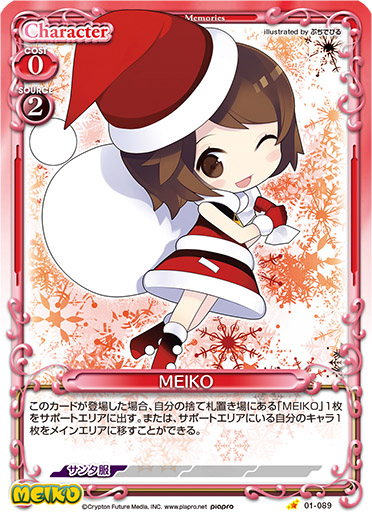 | このカードが登場した場合、自分の捨て札置き場にある「MEIKO」1枚をサポートエリアに出す。または、サポートエリアにいる自分のキャラ1枚をメインエリアに移すことができる。 | ||