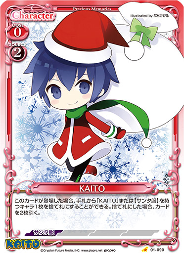 | このカードが登場した場合、手札から「KAITO」または【サンタ服】を持つキャラ1枚を捨て札にすることができる。捨て札にした場合、カードを2枚引く。 | ||