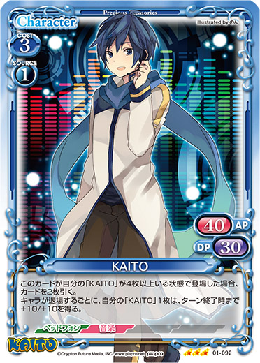 | このカードが自分の「KAITO」が4枚以上いる状態で登場した場合、カードを2枚引く。キャラが退場するごとに、自分の「KAITO」1枚は、ターン終了時まで+10/+10を得る。 | ||