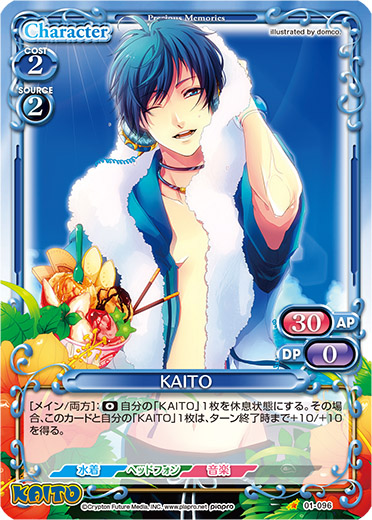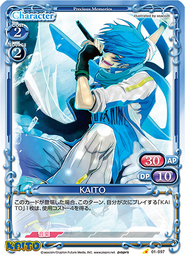| このカードが登場した場合、このターン、自分が次にプレイする「KAITO」1枚は、使用コスト-4を得る。 | ||