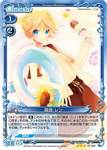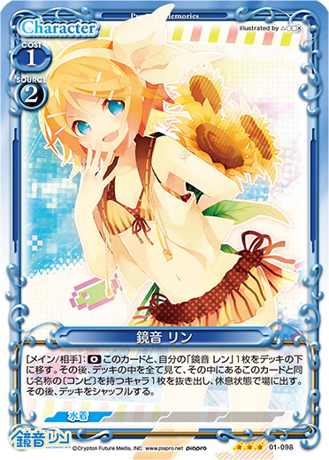 | [メイン/相手]:《0》このカードと、自分の「鏡音 レン」1枚をデッキの下に移す。その後、デッキの中を全て見て、その中にあるこのカードと同じ名称の〔コンビ〕を持つキャラ1枚を抜き出し、休息状態で場に出す。その後、デッキをシャッフルする。 | ||