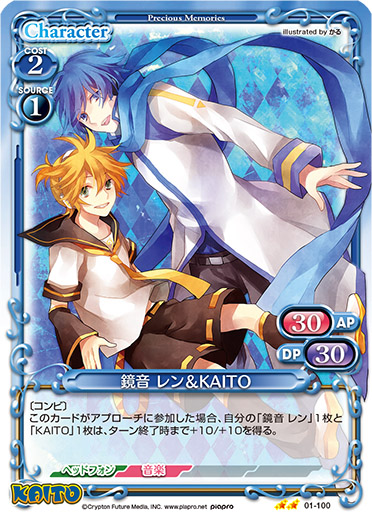 | 〔コンビ〕このカードがアプローチに参加した場合、自分の「鏡音 レン」1枚と「KAITO」1枚は、ターン終了時まで+10/+10を得る。 | ||