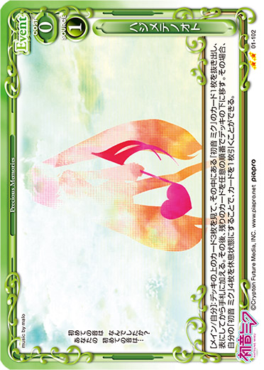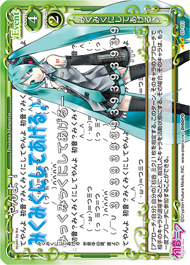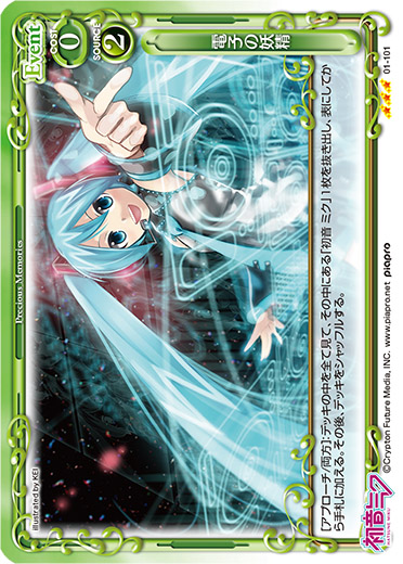 | [メイン/自分]:デッキの上のカード3枚を見て、その中にある『初音 ミク』のカード1枚を抜き出し、表にしてから手札に加える。その後、残りのカードを任意の順番でデッキの下に移す。その場合、自分の「初音 ミク」4枚を休息状態にすることで、カードを1枚引くことができる。 | ||
