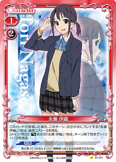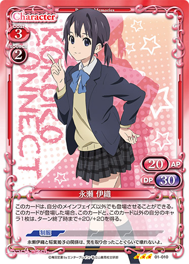 | このカードが登場した場合、このターン、自分が次にプレイする「永瀬 伊織」1枚は、使用コスト-3を得る。[メイン/両方]:《休》自分の「永瀬 伊織」1枚は、ターン終了時まで+10/+10を得る。 | ||