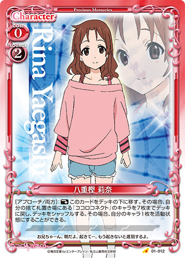 | [アプローチ/両方]:《休》このカードをデッキの下に移す。その場合、自分の捨て札置き場にある『ココロコネクト』のキャラを7枚までデッキに戻し、デッキをシャッフルする。その場合、自分のキャラ1枚を活動状態にすることができる。 | ||