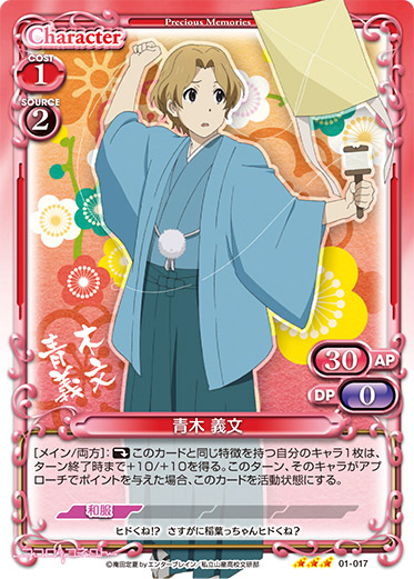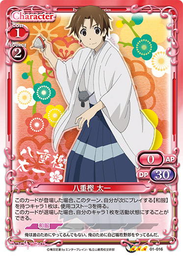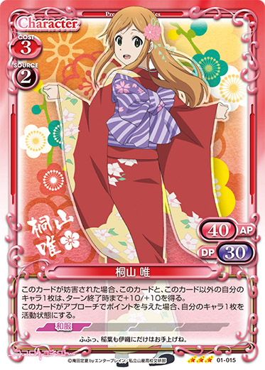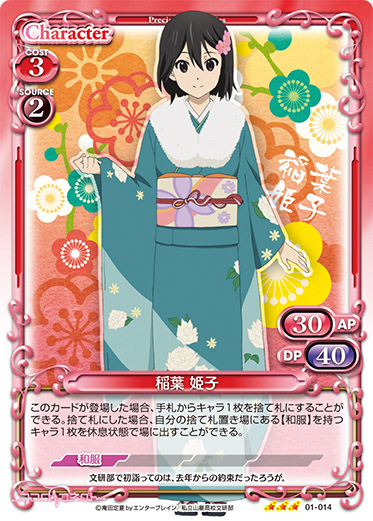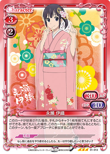 | このカードが登場した場合、このターン、自分が次にプレイする【和服】を持つキャラ1枚は、使用コスト-3を得る。このカードが退場した場合、自分のキャラ1枚を活動状態にすることができる。 | ||