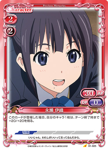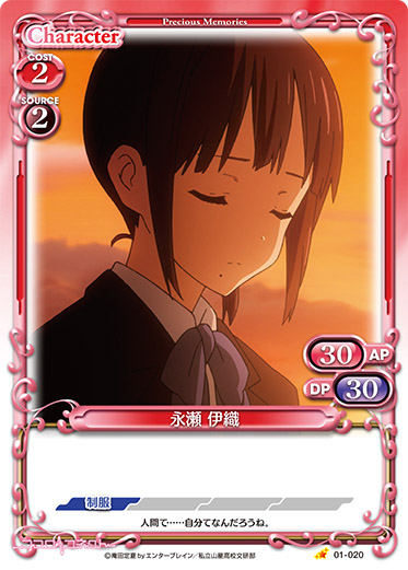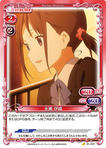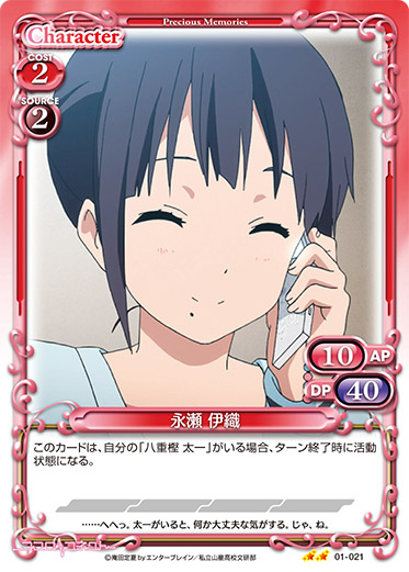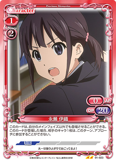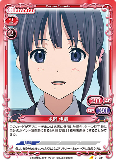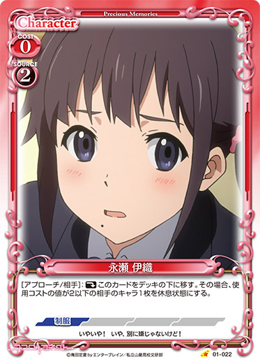 | このカードがアプローチまたは妨害に参加した場合、ターン終了時に自分のポイント置き場にある「永瀬 伊織」1枚を表向きにすることができる。 | ||