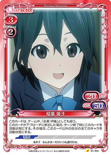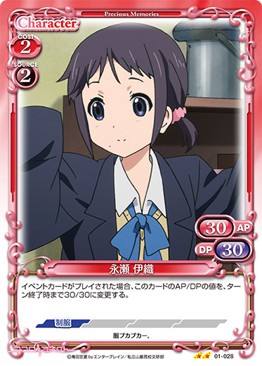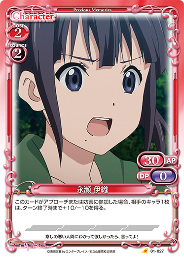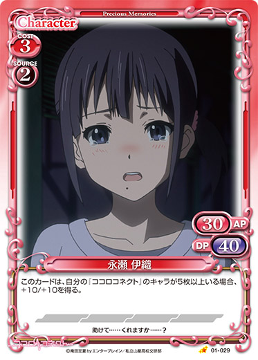 | このカードは、ゲーム中、「永瀬 伊織」としても扱う。このカードがアプローチに参加した場合、ターン終了時にこのカードを活動状態にする。その場合、このカード以外の自分の全てのキャラを活動状態にする。 | ||