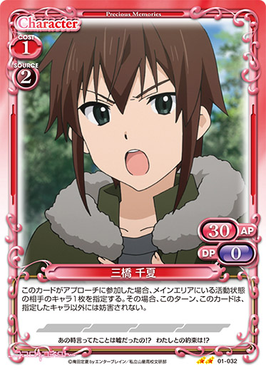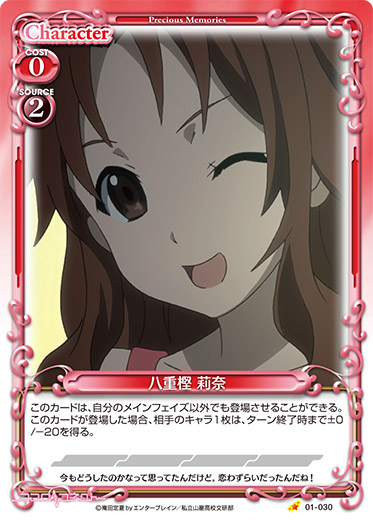 | このカードは、自分のメインフェイズ以外でも登場させることができる。このカードが登場した場合、相手のキャラ1枚は、ターン終了時まで±0/-20を得る。 | ||
