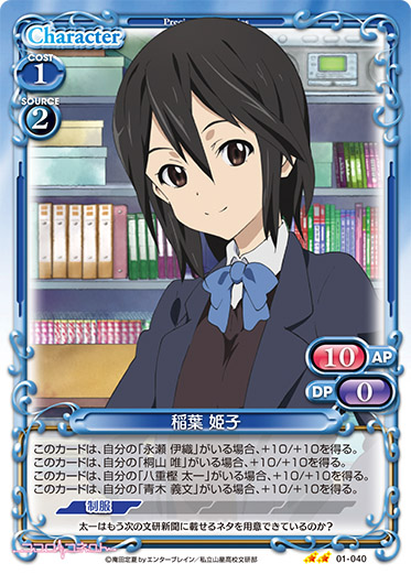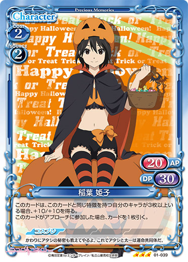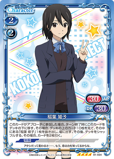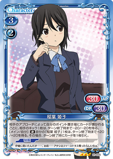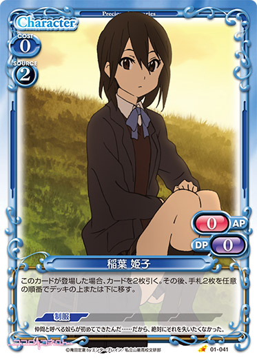 | 相手のアプローチによって自分のポイント置き場にカードが置かれるごとに、相手のキャラ1枚は、ターン終了時まで-20/-20を得る。[メイン/自分]:《2》自分の「稲葉 姫子」1枚は、ターン終了時まで+20/+20を得る。その場合、ターン終了時にカードを1枚引く。 | ||