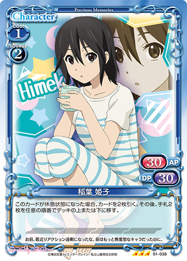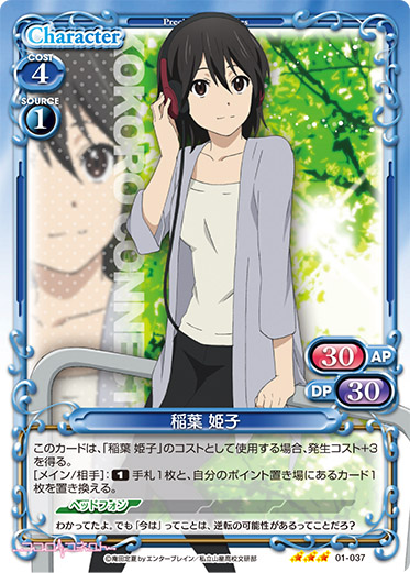 | このカードは、「稲葉 姫子」のコストとして使用する場合、発生コスト+3を得る。[メイン/相手]:《1》手札1枚と、自分のポイント置き場にあるカード1枚を置き換える。 | ||