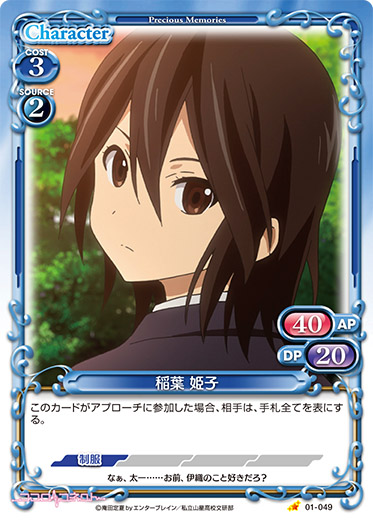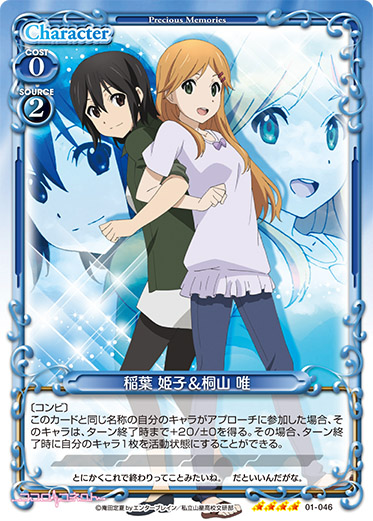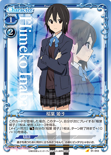 | このカードが登場した場合、このターン、自分が次にプレイする「稲葉 姫子」1枚は、使用コスト-3を得る。[メイン/両方]:《休》自分の「稲葉 姫子」1枚は、ターン終了時まで+10/+10を得る。 | ||