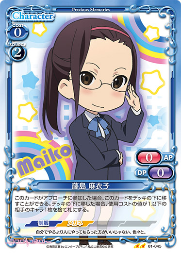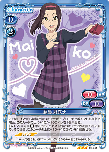 | このカードと同じ特徴を持つキャラがアプローチでポイントを与えた場合、このカードの上に+10/+10コインを1個乗せる。[メイン/自分]:《0》手札から【メガネ】を持つキャラ2枚を捨て札にする。その場合、このカードの上に+10/+10コインを1個乗せる。 | ||