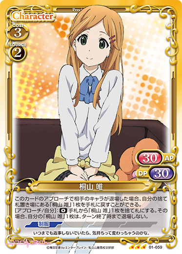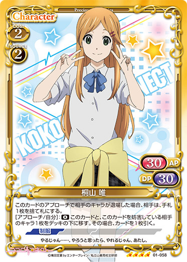 | このカードのアプローチで相手のキャラが退場した場合、自分の捨て札置き場にある「桐山 唯」1枚を手札に戻すことができる。[アプローチ/自分]:《0》手札から「桐山 唯」1枚を捨て札にする。その場合、自分の「桐山 唯」1枚は、ターン終了時まで退場しない。 | ||