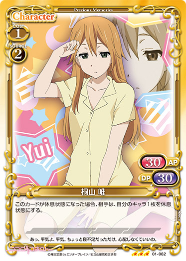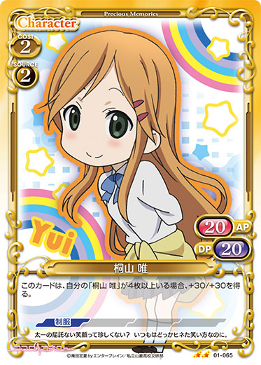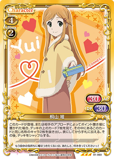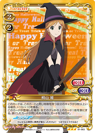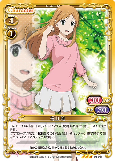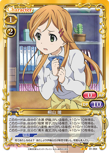 | このカードは、自分の「桐山 唯」が4枚以上いる場合、+30/+30を得る。 | ||
