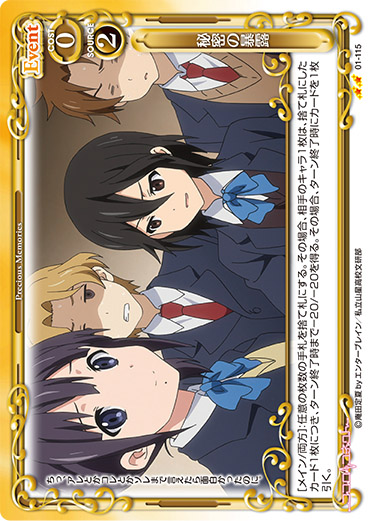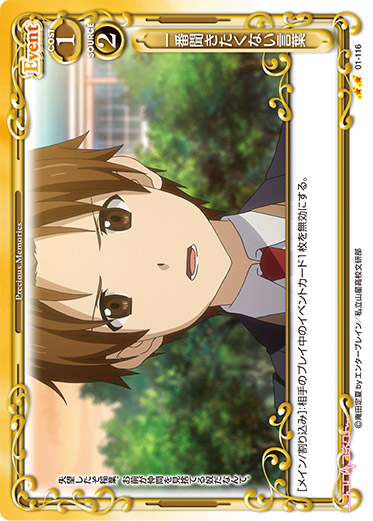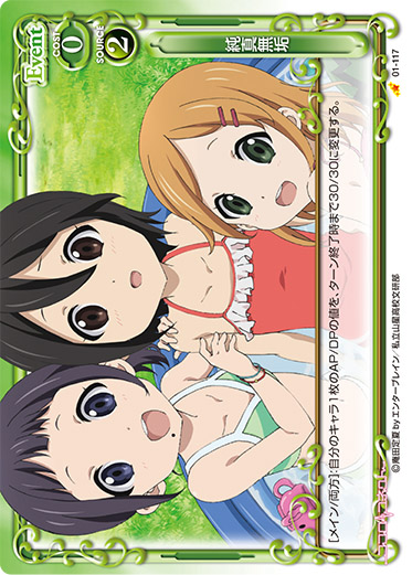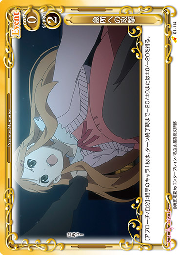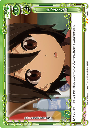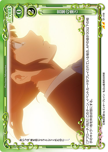 | [アプローチ/両方]:このターン、イベントカードがプレイされている場合、APの値が30以下の相手のキャラ1枚を休息状態にする。 | ||