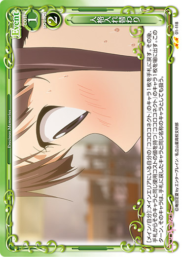 | [メイン/自分]:メインエリアにいる自分の『ココロコネクト』のキャラ1枚を手札に戻す。その後、手札からそのキャラと同じ使用コストの値を持つ『ココロコネクト』のキャラ1枚を場に出す。このターン、そのキャラは、手札に戻したキャラと同じ名称のキャラとしても扱う。 | ||