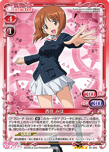 | [アプローチ/自分]:《0》このカードがアプローチに参加している場合、デッキの上のカード5枚を見て、その中にある使用コストの値が2以下の【戦車道】を持つキャラ1枚を抜き出し、サポートエリアに出す。その後、残りのカードを任意の順番でデッキの下に移す。 | ||