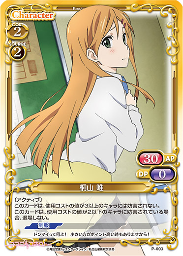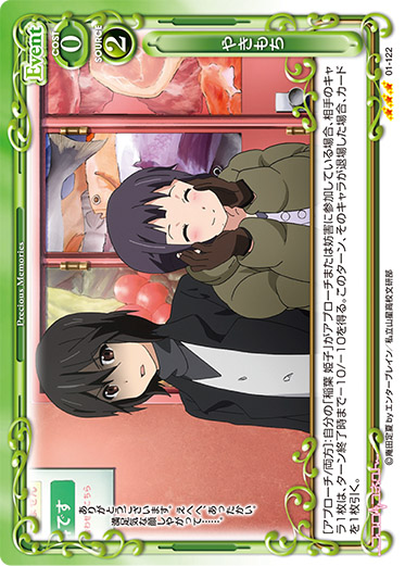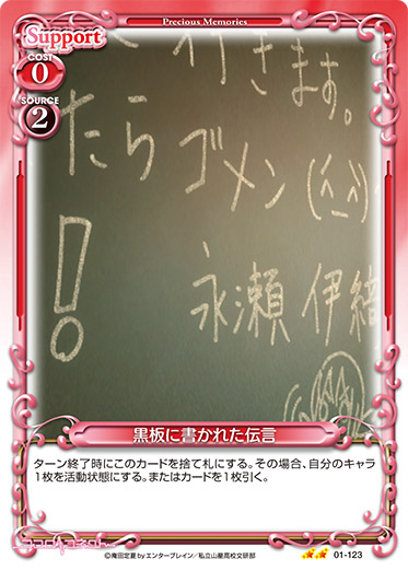 | ターン終了時にこのカードを捨て札にする。その場合、自分のキャラ1枚を活動状態にする。またはカードを1枚引く。 | ||