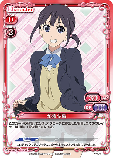 | [アプローチ/両方]:自分の「稲葉 姫子」がアプローチまたは妨害に参加している場合、相手のキャラ1枚は、ターン終了時まで-10/-10を得る。このターン、そのキャラが退場した場合、カードを1枚引く。 | ||