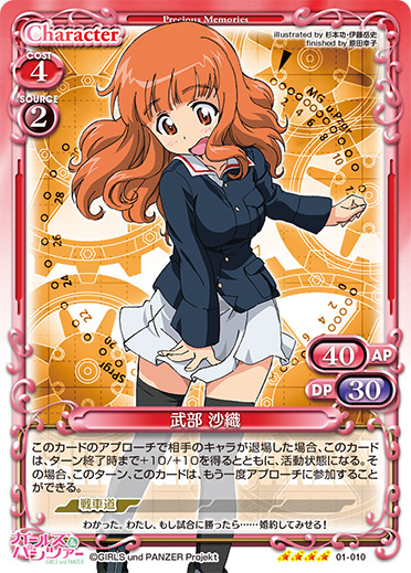 | サポートエリアに自分の「武部 沙織」と「五十鈴 華」と「秋山 優花里」と「冷泉 麻子」がいる場合、自分の全てのキャラは、+10/+10を得る。このカードが退場した場合、自分の捨て札置き場にある【戦車道】を持つキャラ1枚をサポートエリアに出すことができる。 | ||