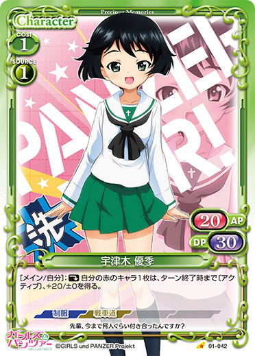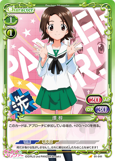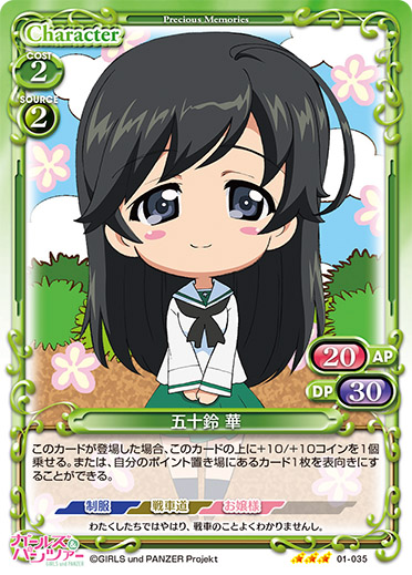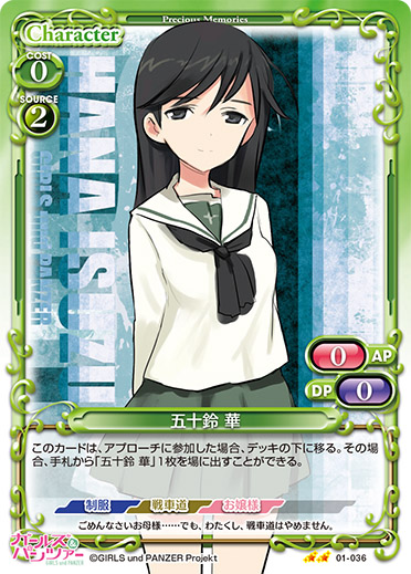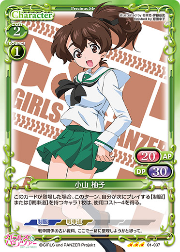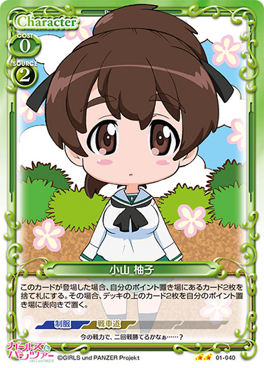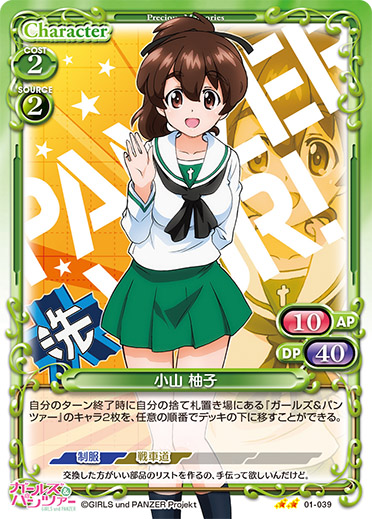 | このカードが登場した場合、このターン、自分が次にプレイする【制服】または【戦車道】を持つキャラ1枚は、使用コスト-4を得る。 | ||