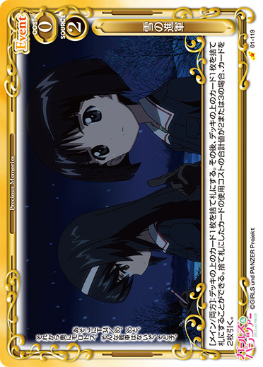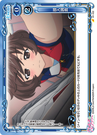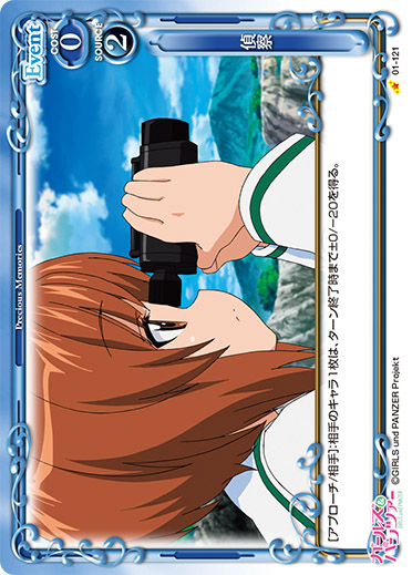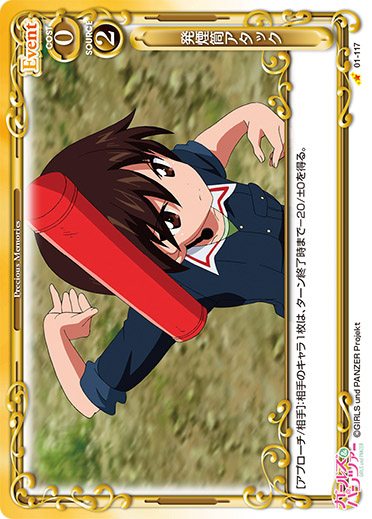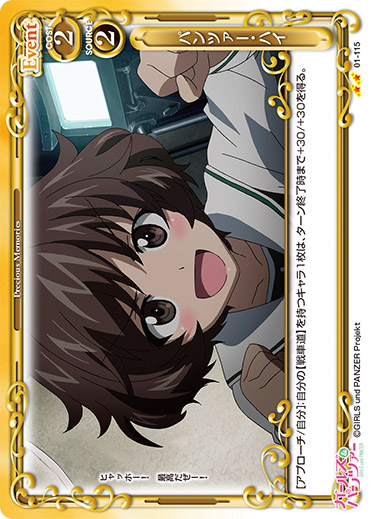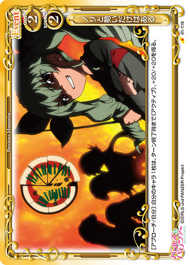 | [アプローチ/自分]:自分の【戦車道】を持つキャラ1枚は、ターン終了時まで+30/+30を得る。 | ||