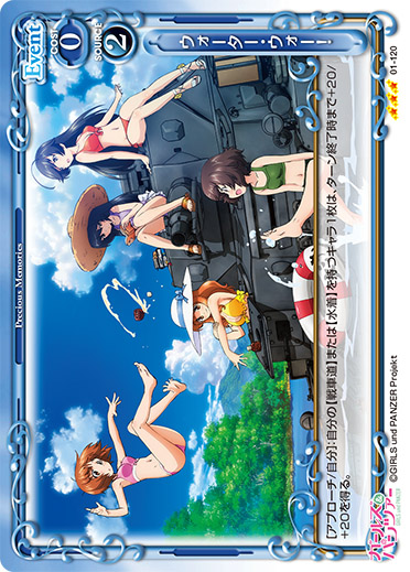 | [アプローチ/自分]:自分の【戦車道】または【水着】を持つキャラ1枚は、ターン終了時まで+20/+20を得る。 | ||