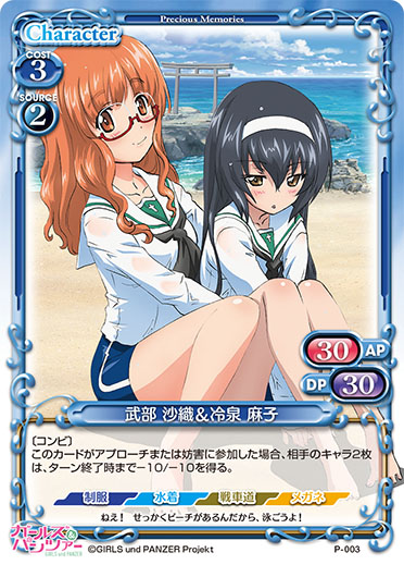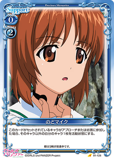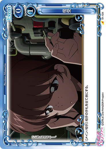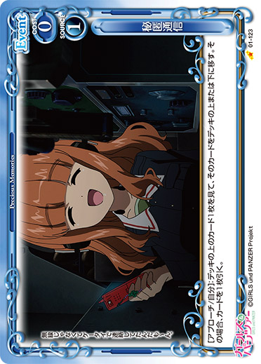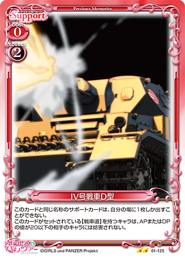 | このカードと同じ名称のサポートカードは、自分の場に1枚しか出すことができない。このカードがセットされている【戦車道】を持つキャラは、APまたはDPの値が20以下の相手のキャラには妨害されない。 | ||