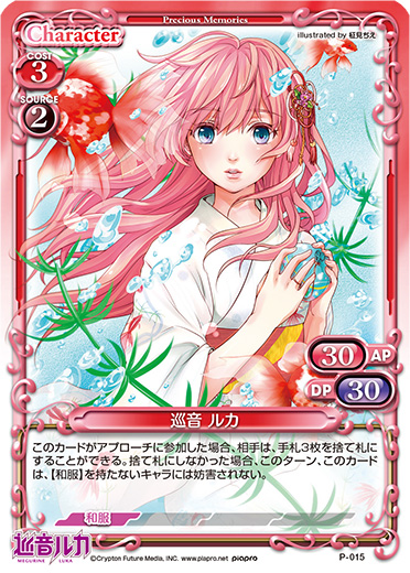 | このカードがアプローチに参加した場合、相手は、手札3枚を捨て札にすることができる。捨て札にしなかった場合、このターン、このカードは、【和服】を持たないキャラには妨害されない。 | ||