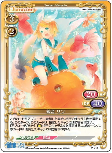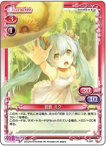 | このカードは、手札にある場合、自分の「初音 ミク」1枚につき、使用コスト-1を得る。 このカードは、サポートカードがセットされている場合、+20/+20を得る。 | ||