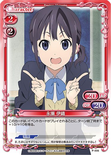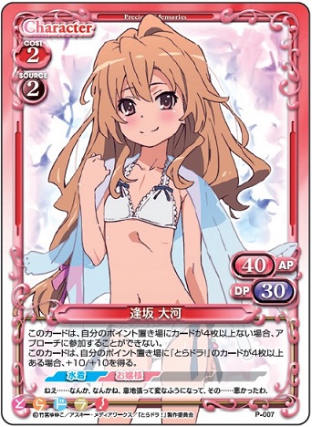 | このカードは、自分のポイント置き場にカードが4枚以上ない場合、アプローチに参加することが出来ない。 このカードは、自分のポイント置き場に「とらドラ!」のカードが4枚以上ある場合、+10/+10を得る。 | ||