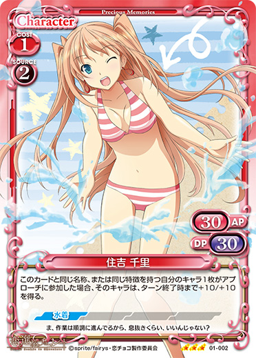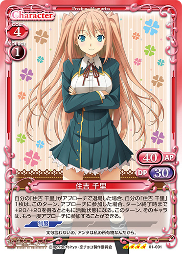 | 自分の「住吉 千里」がアプローチで退場した場合、自分の「住吉 千里」1枚は、このターン、アプローチに参加した場合、ターン終了時まで+20/+20を得るとともに活動状態になる。このターン、そのキャラは、もう一度アプローチに参加することができる。 | ||