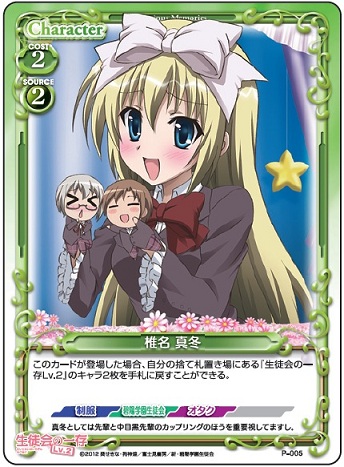 | このカードが登場した場合、自分の捨て札置き場にある「生徒会の一存Lv.2」のキャラ2枚を手札に戻すことができる。 | ||