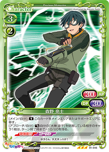 | [メイン/自分]:《1》このカードをメインエリアまたはサポートエリアに移す。 [アプローチ/自分]:《休》自分の「大神 涼子」を妨害している相手のキャラ1枚は、ターン終了時まで-10/±0を得る。 | ||