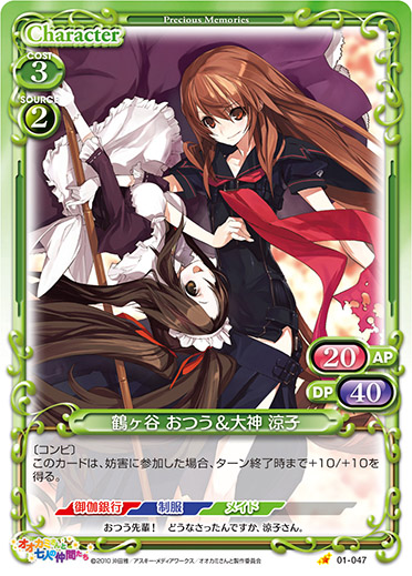 | 〔コンビ〕このカードが妨害された場合、このカードと、妨害に参加しているキャラ1枚は、ターン終了時まで±0/+30を得る。 | ||