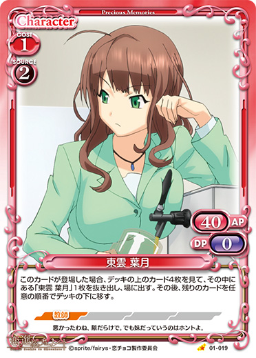 | このカードが登場した場合、デッキの上のカード4枚を見て、その中にある「東雲 葉月」1枚を抜き出し、場に出す。その後、残りのカードを任意の順番でデッキの下に移す。 | ||