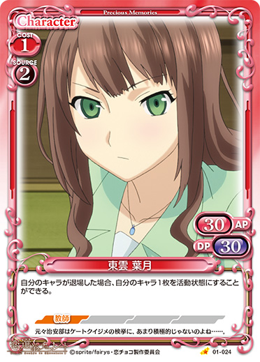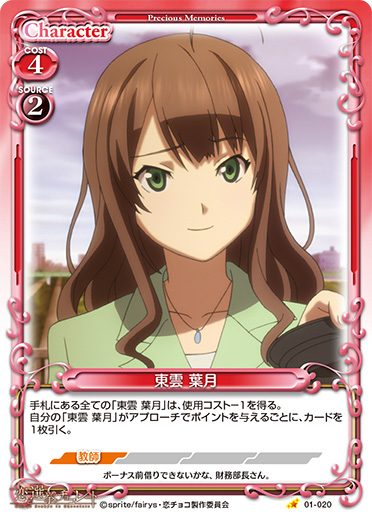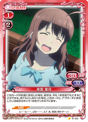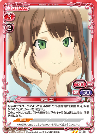 | 相手のアプローチによって自分のポイント置き場に「東雲 葉月」が置かれるごとに、カードを1枚引く。このカードは、使用コストの値が2以下のキャラを妨害した場合、活動状態になる。 | ||