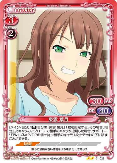 | [メイン/自分]:《0》自分の「東雲 葉月」1枚を指定する。その場合、指定したキャラのアプローチで相手のキャラが退場した場合、サポートエリアにいるAP/DPの値を持つ相手のキャラ1枚をデッキの下に移すことができる。 | ||
