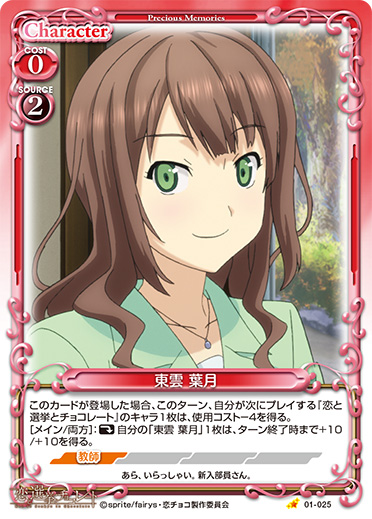 | このカードが登場した場合、このターン、自分が次にプレイする『恋と選挙とチョコレート』のキャラ1枚は、使用コスト-4を得る。[メイン/両方]:《休》自分の「東雲 葉月」1枚は、ターン終了時まで+10/+10を得る。 | ||