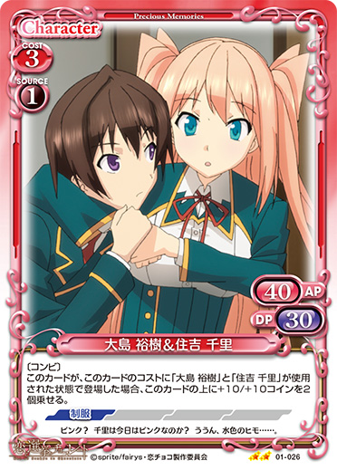 | 〔コンビ〕このカードが、このカードのコストに「大島 裕樹」と「住吉 千里」が使用された状態で登場した場合、このカードの上に+10/+10コインを2個乗せる。 | ||