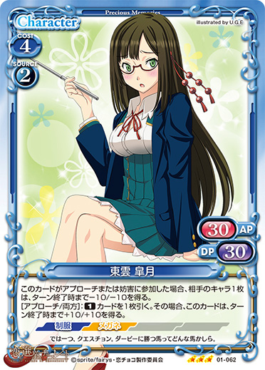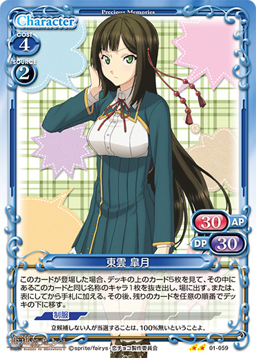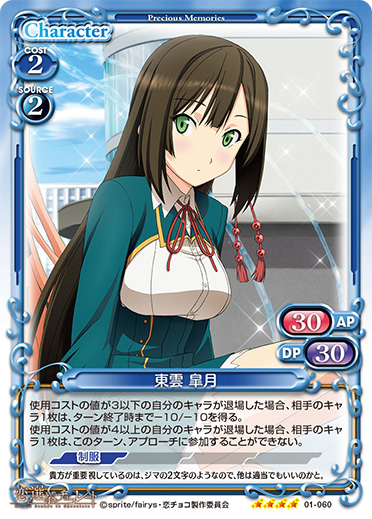 | 手札にある全ての「東雲 皐月」は、使用コスト-1を得る。[アプローチ/自分]:《0》このカードと、このカードを妨害している相手のキャラ1枚は、ターン終了時まで±0/-30を得る。その場合、カードを1枚引く。 | ||