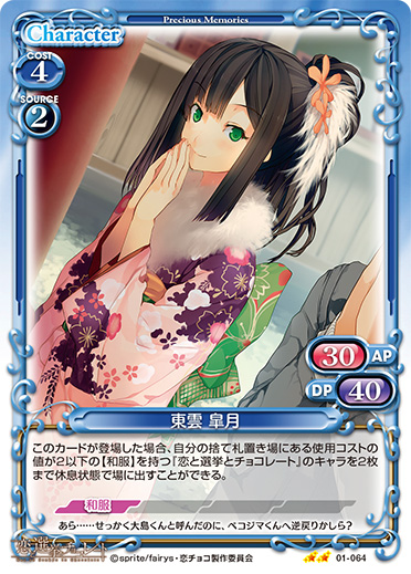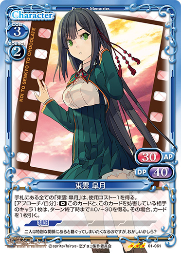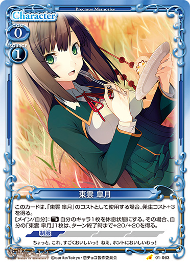 | このカードは、「東雲 皐月」のコストとして使用する場合、発生コスト+3を得る。[メイン/自分]:《休》自分のキャラ1枚を休息状態にする。その場合、自分の「東雲 皐月」1枚は、ターン終了時まで+20/+20を得る。 | ||