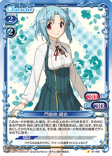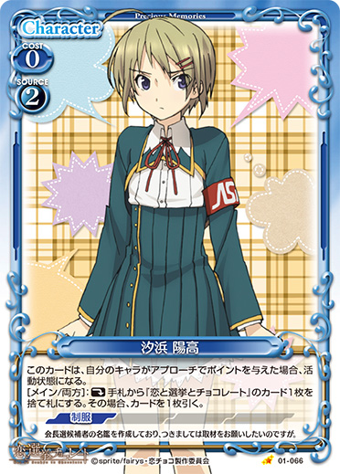 | このカードが登場した場合、自分の捨て札置き場にある使用コストの値が2以下の【和服】を持つ『恋と選挙とチョコレート』のキャラを2枚まで休息状態で場に出すことができる。 | ||