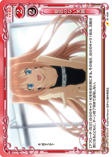 | 《使用条件》:このターン、自分のポイント置き場にカードが2枚以上置かれている。[アプローチ/相手]:このターン、相手の全てのキャラは、アプローチに参加することができない。 | ||