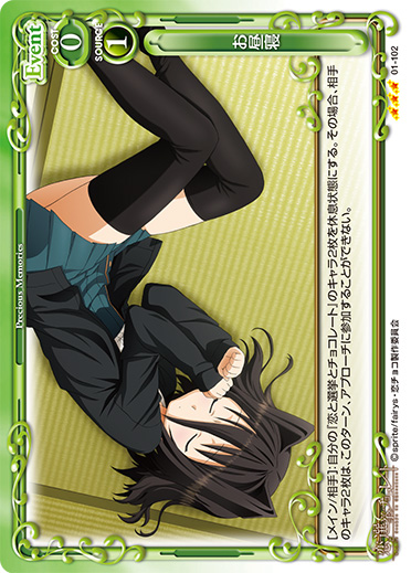 | [メイン/相手]:自分の『恋と選挙とチョコレート』のキャラ2枚を休息状態にする。その場合、相手のキャラ2枚は、このターン、アプローチに参加することができない。 | ||