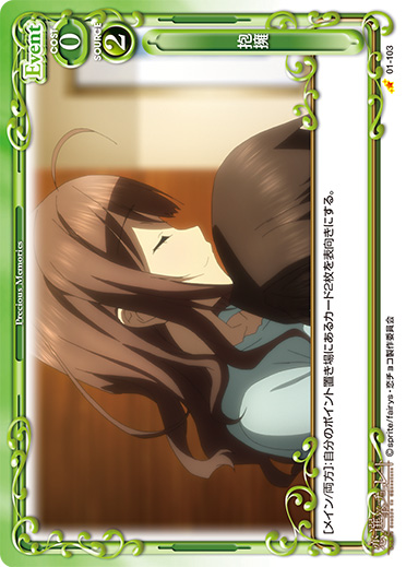 | [メイン/自分]:自分のキャラ2枚を休息状態にする。その場合、自分の捨て札置き場にあるキャラを休息状態にしたキャラの使用コストの合計値と同じ枚数までデッキに戻し、デッキをシャッフルする。その場合、ターン終了時にカードを1枚引く。 | ||