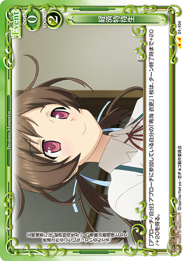 | [アプローチ/自分]:アプローチに参加している自分の「木場 美冬」1枚は、ターン終了時まで+20/+20を得る。 | ||