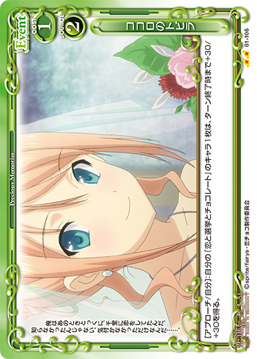 | [アプローチ/自分]:自分の『恋と選挙とチョコレート』のキャラ1枚は、ターン終了時まで+30/+30を得る。 | ||